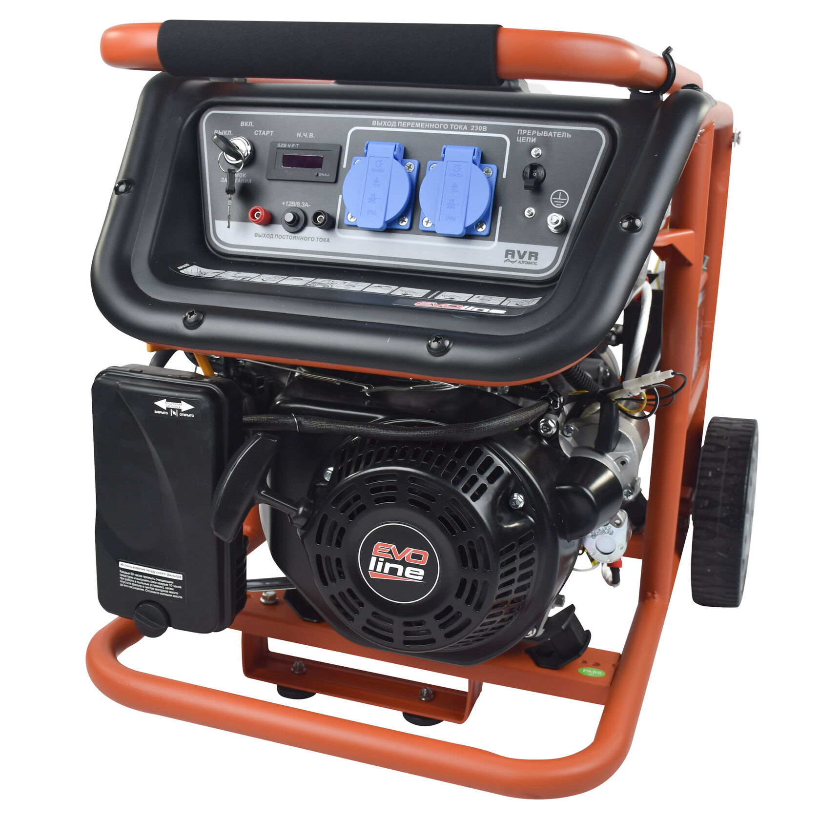 Электрогенератор EVOline KB 3300 E – бензиновый однофазный (1 фазный) генератор с максимальной мощностью 3 кВА. Силовым агрегатом данной модели является четырехтактный двигатель ZONGSHEN ZS170FE. Генератор оснащен электрическим запуском. Рама выполнена из высококачественной стали, которая служит не только для защиты двигателя, но и для удобной транспортировки электростанции. Объем топливного бака составляет 15 литров, что дает примерно 10 часов непрерывной работы в зависимости от нагрузки. Уровень шума при работе генератора составляет 76,5 дБ. Данная модель идеально подходит как для дома, так и для малого или среднего бизнеса. Оснащена транспортировочным комплектом с колесами, счетчиком мото-часов, электростартером и 2-мя розетками, имеет размер (590 x 440 x 500 мм) и вес (52 кг). Гарантия составляет 2 года.