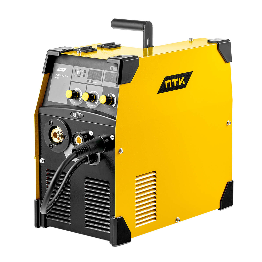 Особенности сварочного полуавтомата MIG 250 GW:- На передней панели аппарата находится многофункциональная панель управления с возможностью регулировок силы сварочного тока, сварочного напряжения, индуктивности.